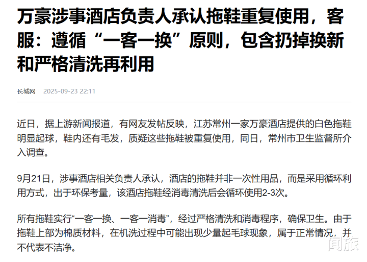起因是,有位姐们儿在常州万豪酒店入住,一拿拖鞋,好家伙,鞋面起球也就算了,鞋里还粘着根毛。她找服务员理论,人家轻飘飘回一句:“这拖鞋我们是回收消毒再用的,给您换双新的哈。”