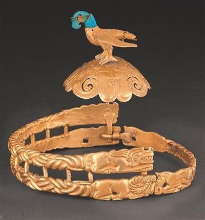r“此冠饰1972年出土于鄂尔多斯市杭锦旗,同批出土了200多件金银器,都有虎、狼、马、羊、鸟等浅浮雕动物形象以及虎咬羊、狼咬羊等咬斗场景,具有鲜明的草原文化特色。”2号展厅策展人沈莎莎介绍,“此冠饰是迄今国内发现的唯一匈奴贵族金冠饰,融铸造、锻压、锤打、抽丝等技术于一身,代表了当时金银器制作工艺的最高水平,在中国艺术史、科技史上具有重要地位。”